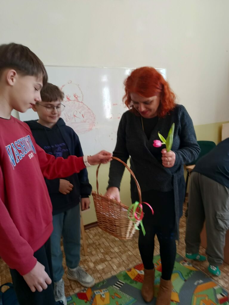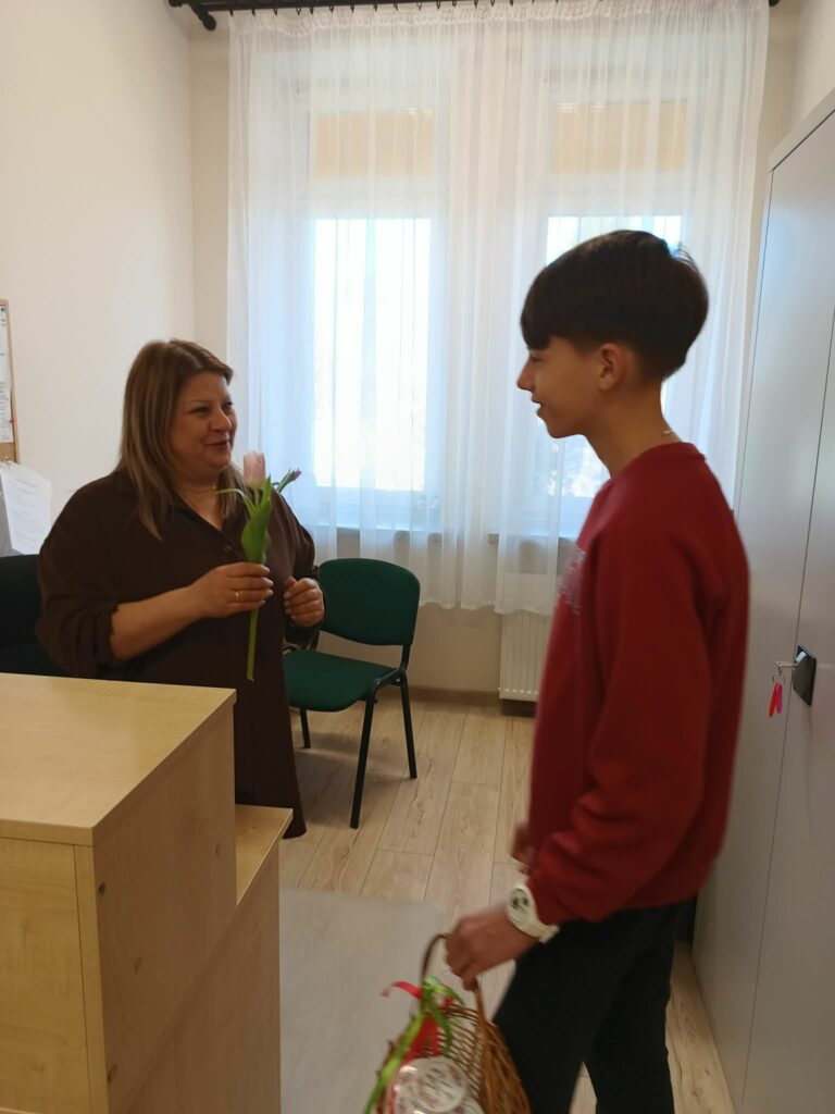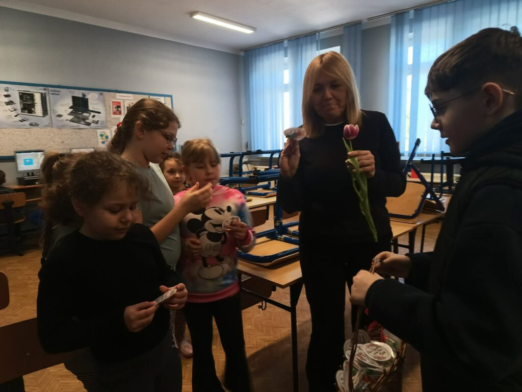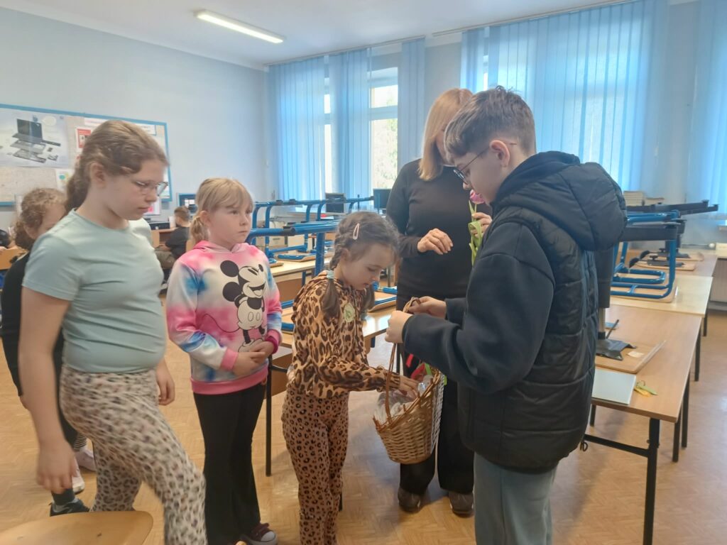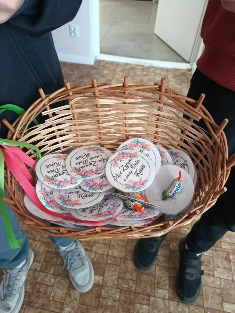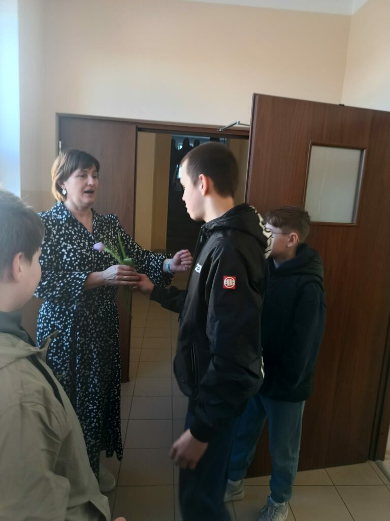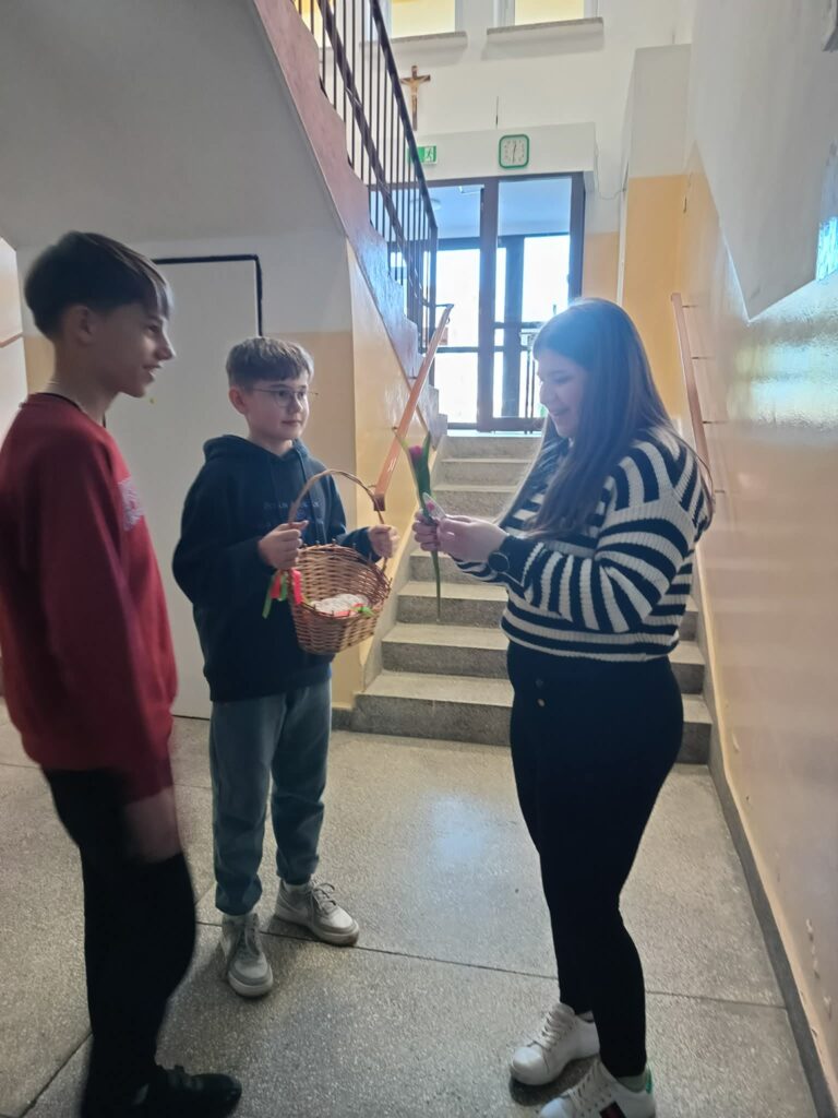 Z tej okazji chłopcy z Samorządu Uczniowskiego, przy wsparciu opiekuna, złożyli najserdeczniejsze życzenia wszystkim Paniom i Dziewczętom. Każda z nich otrzymała słodki upominek wraz z życzeniami. Paniom nauczycielkom oraz paniom pracującym w szkole wręczone zostały również symboliczne tulipany 🌷