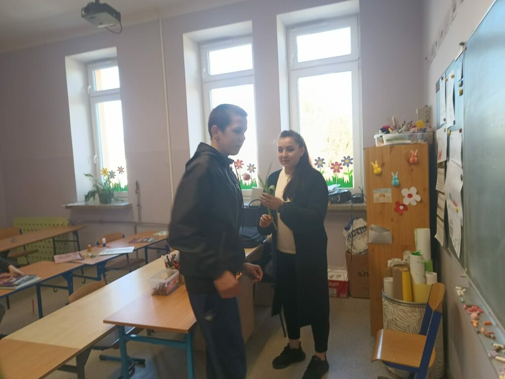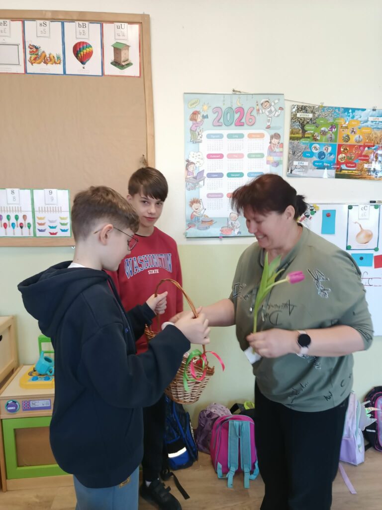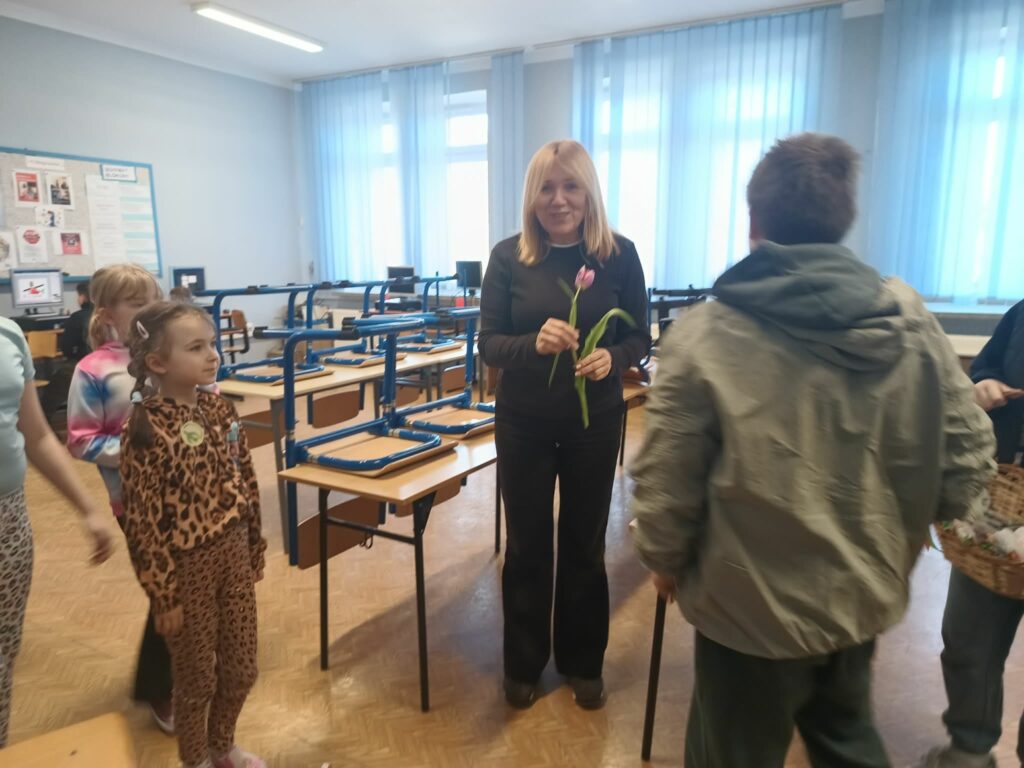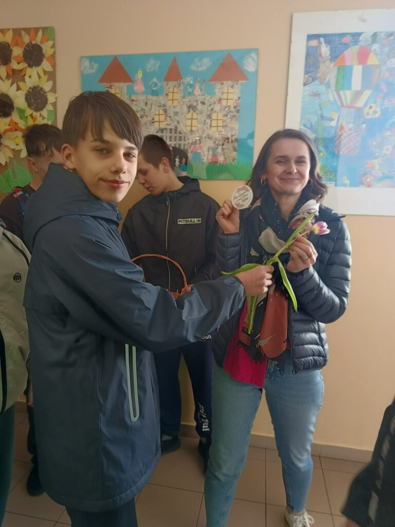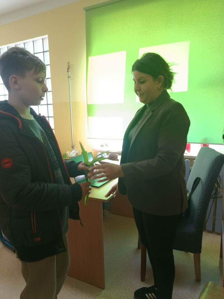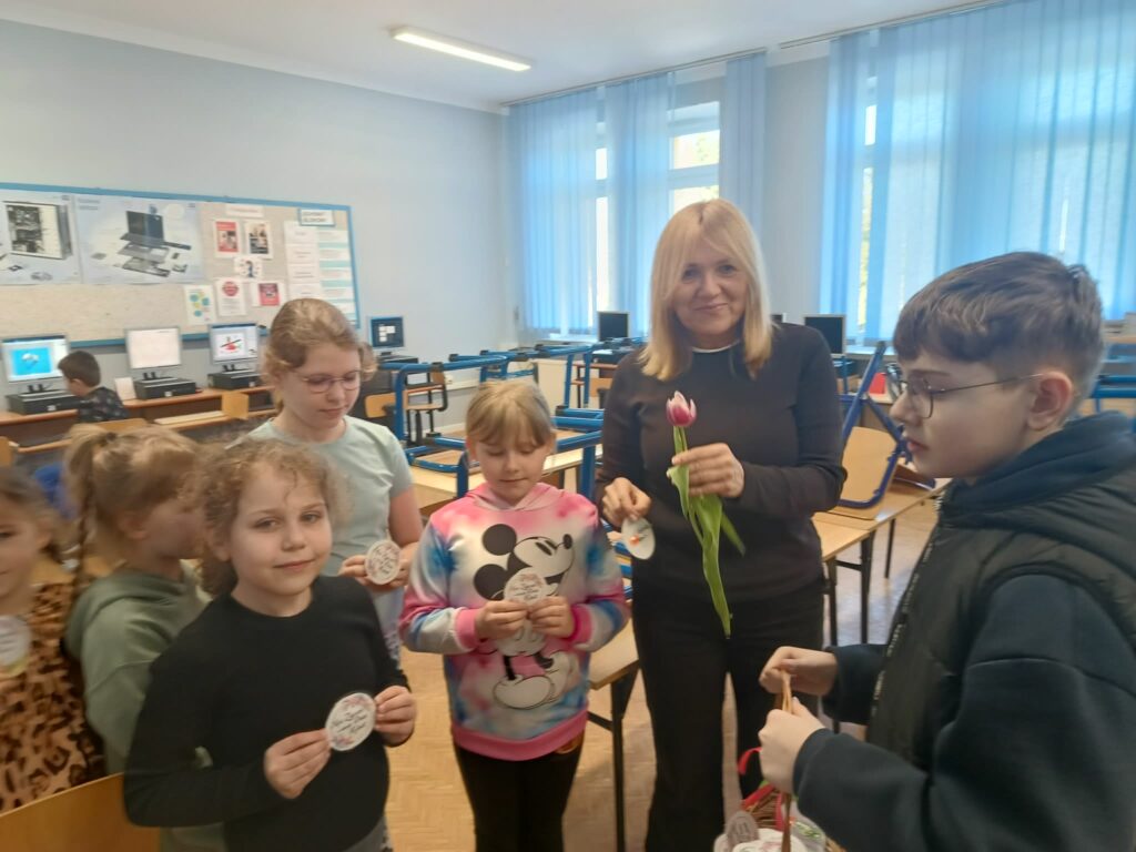 Z tej okazji chłopcy z Samorządu Uczniowskiego, przy wsparciu opiekuna, złożyli najserdeczniejsze życzenia wszystkim Paniom i Dziewczętom. Każda z nich otrzymała słodki upominek wraz z życzeniami. Paniom nauczycielkom oraz paniom pracującym w szkole wręczone zostały również symboliczne tulipany 🌷