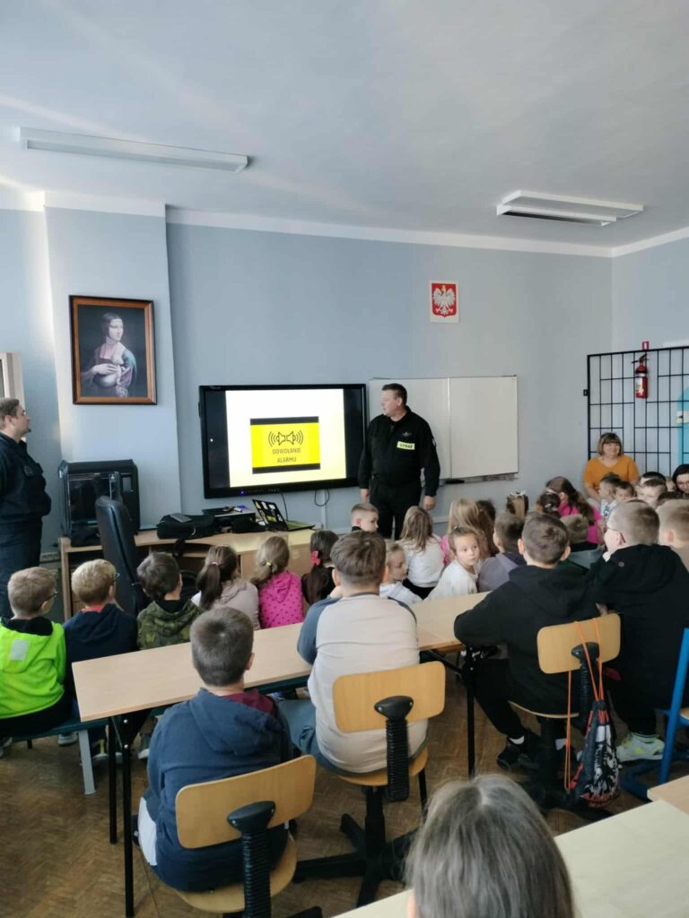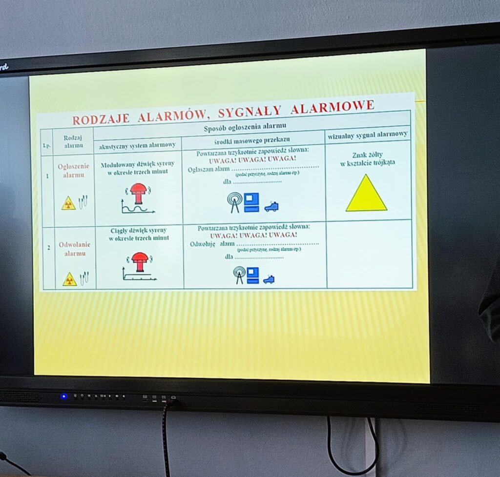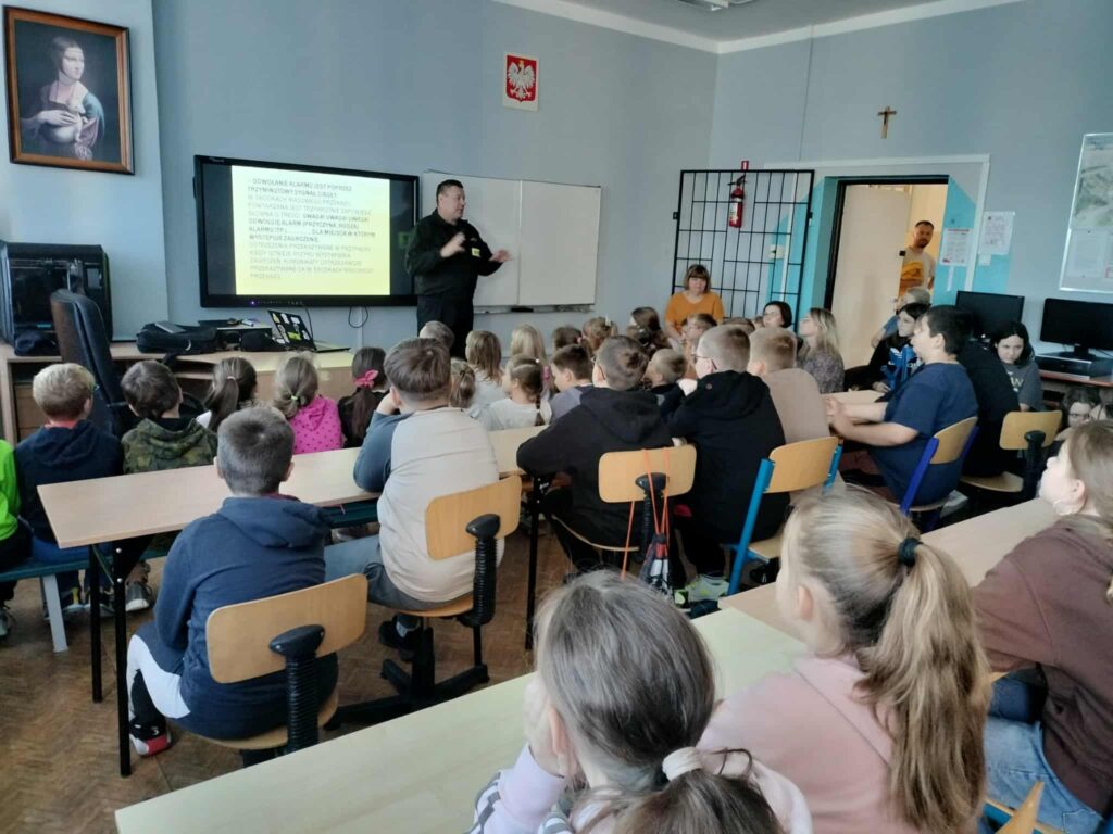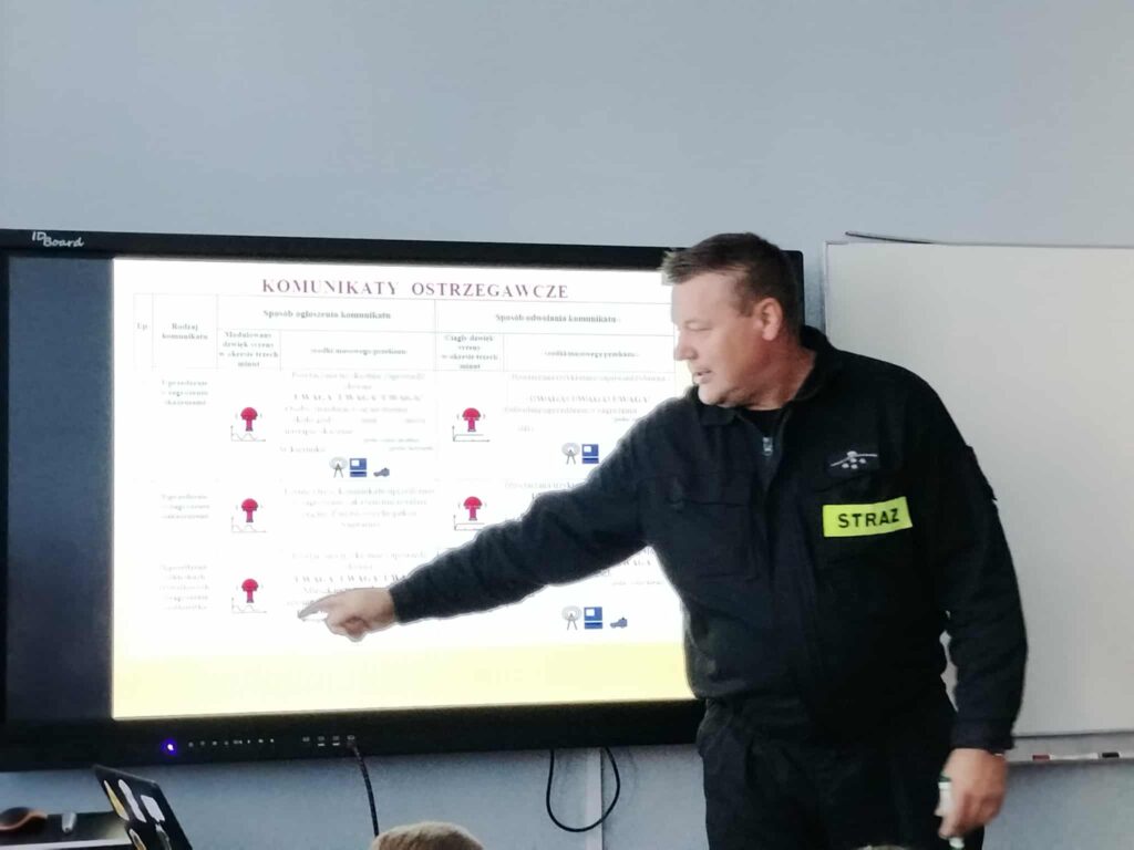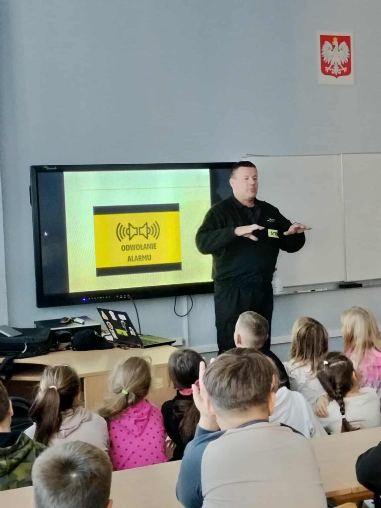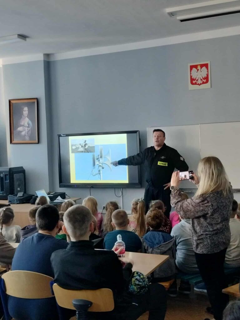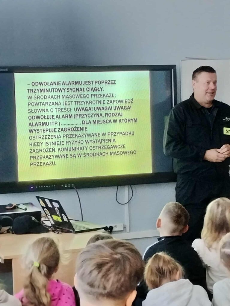Strażacy przybliżyli uczniom oraz nauczycielom tematykę obowiązującego w Polsce systemu alarmowania i ostrzegania ludności. Omówili szczegółowo rodzaje sygnałów alarmowych, ich znaczenie oraz sposób, w jaki są przekazywane. Zwrócili uwagę na konieczność uważnego reagowania na komunikaty ostrzegawcze i stosowania się do obowiązujących procedur.