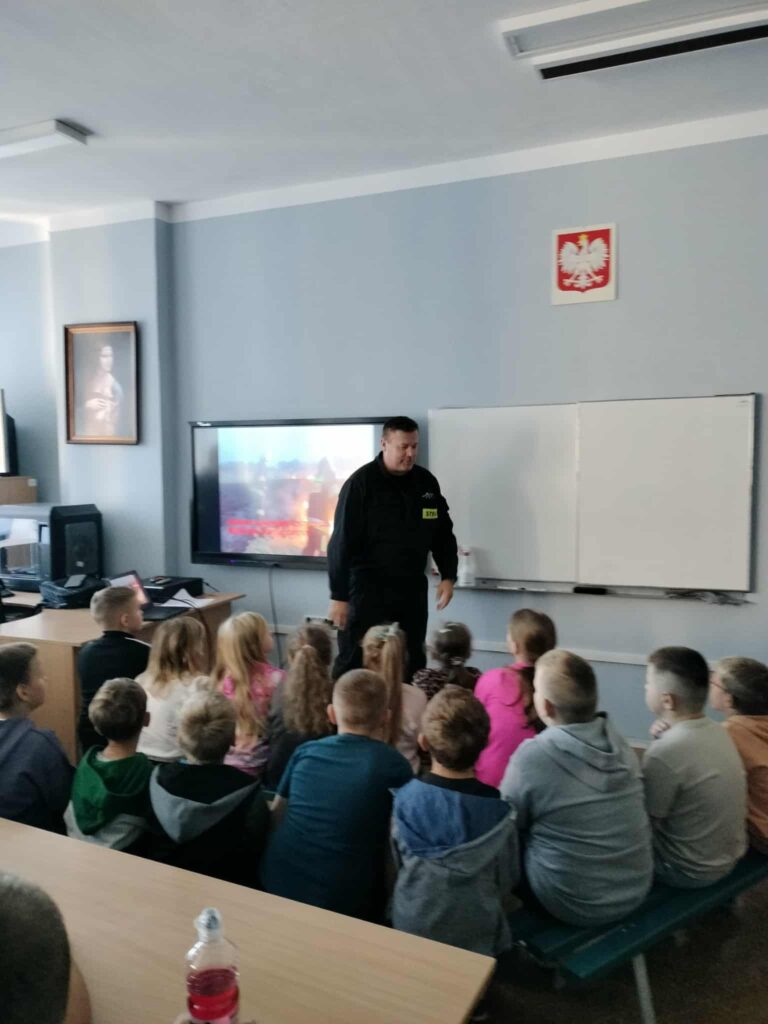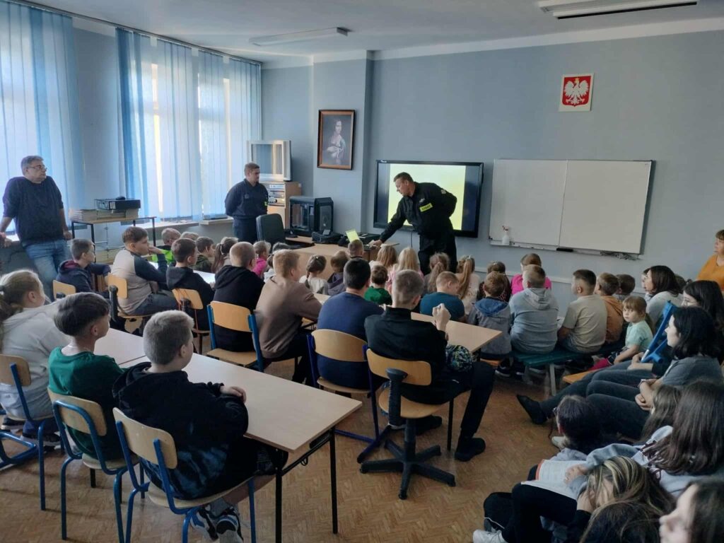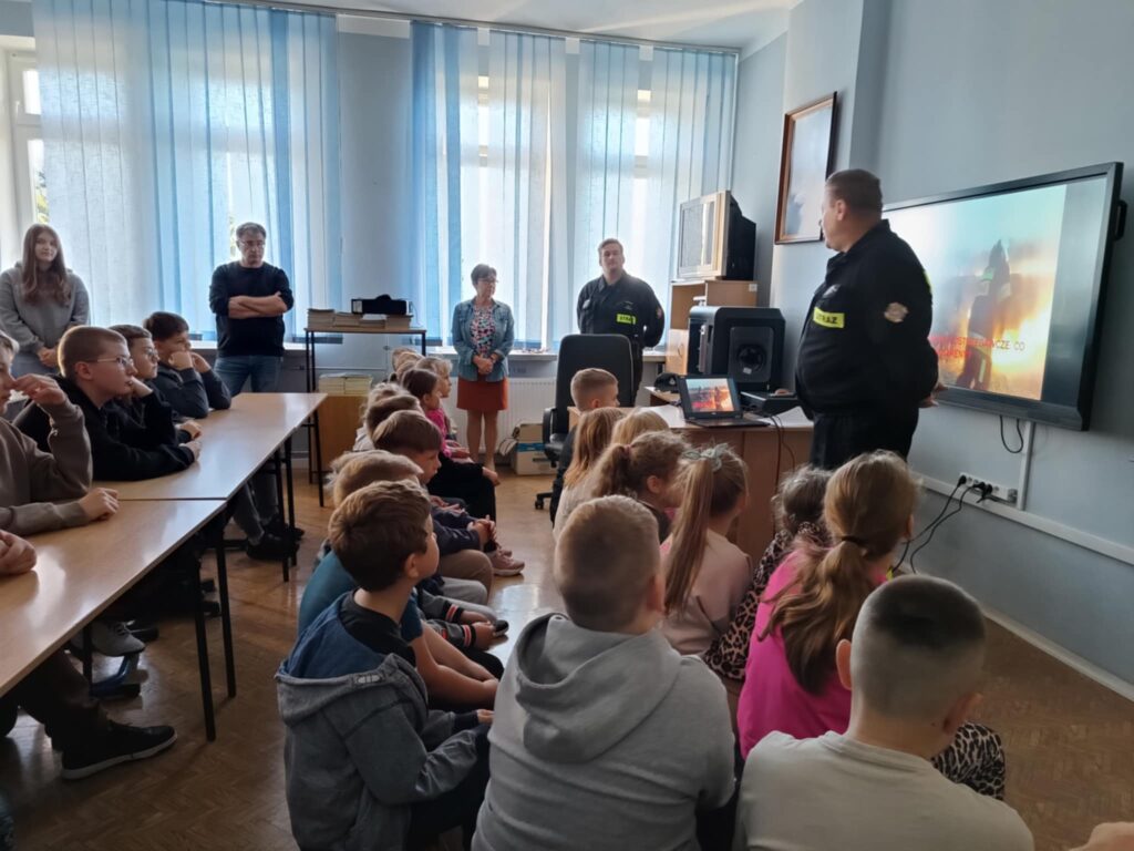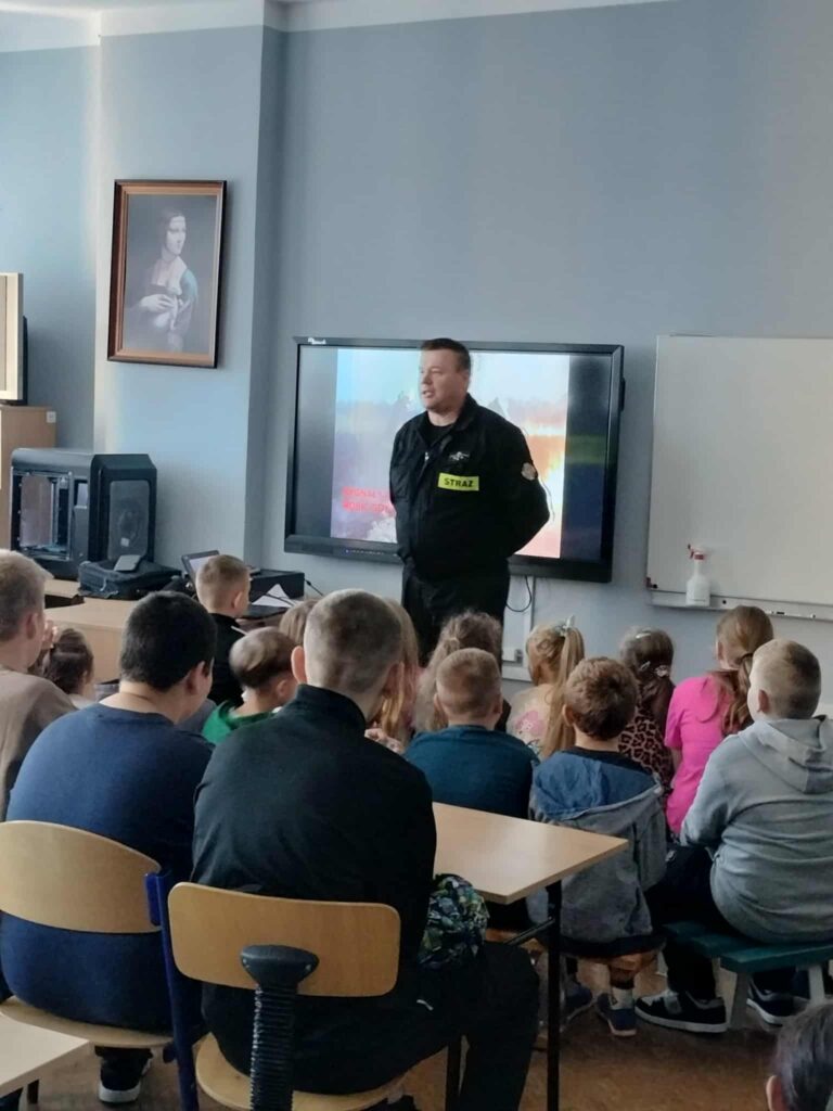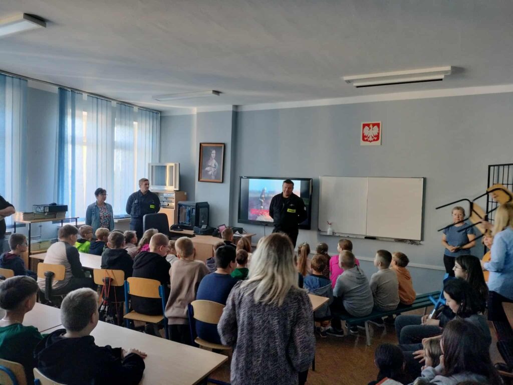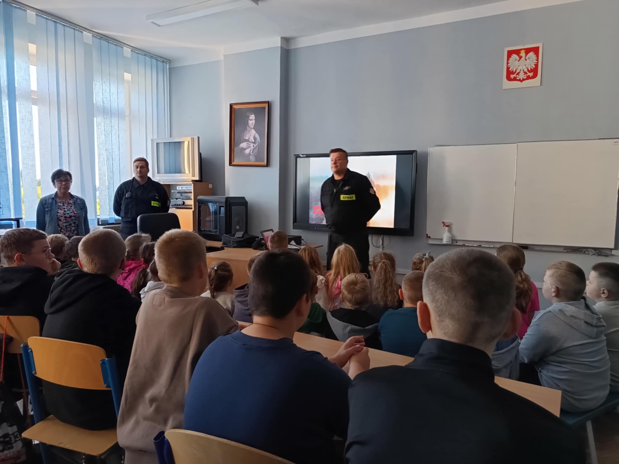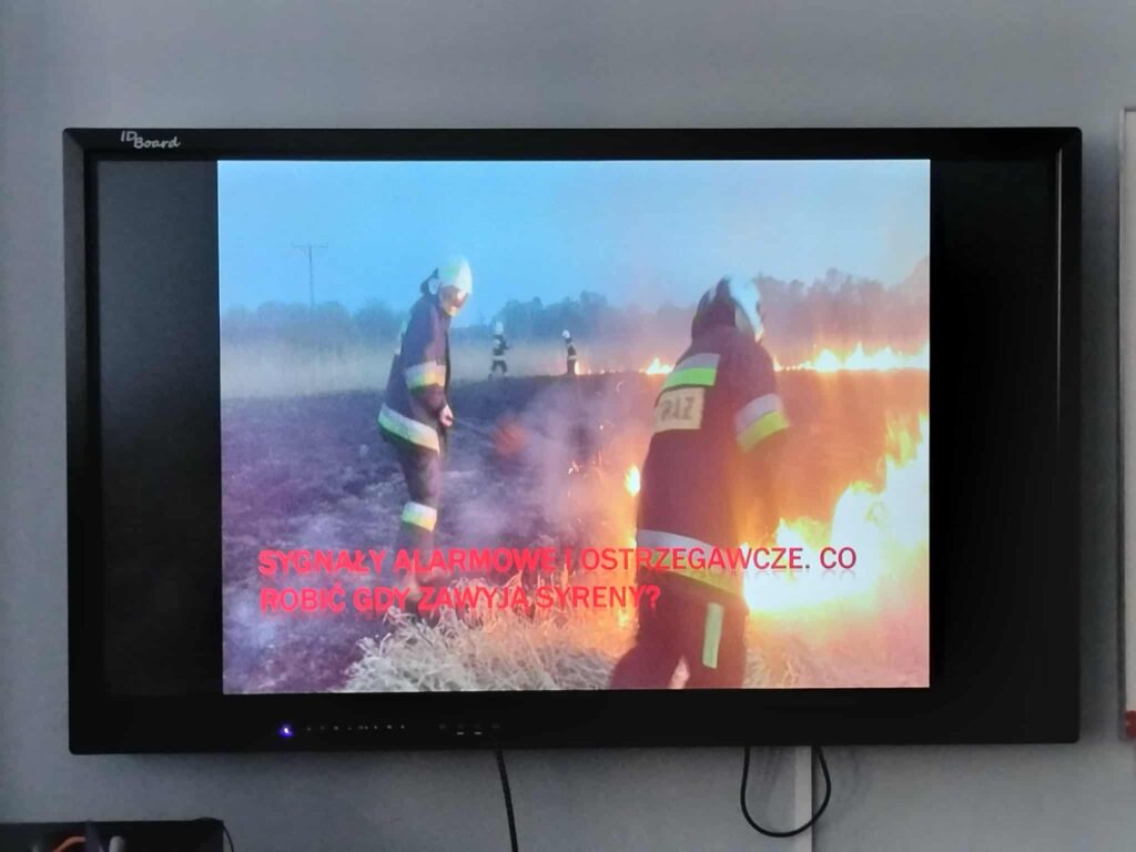 Strażacy przybliżyli uczniom oraz nauczycielom tematykę obowiązującego w Polsce systemu alarmowania i ostrzegania ludności. Omówili szczegółowo rodzaje sygnałów alarmowych, ich znaczenie oraz sposób, w jaki są przekazywane. Zwrócili uwagę na konieczność uważnego reagowania na komunikaty ostrzegawcze i stosowania się do obowiązujących procedur.