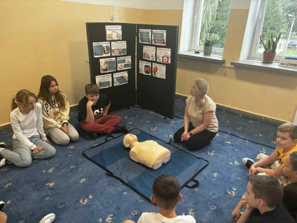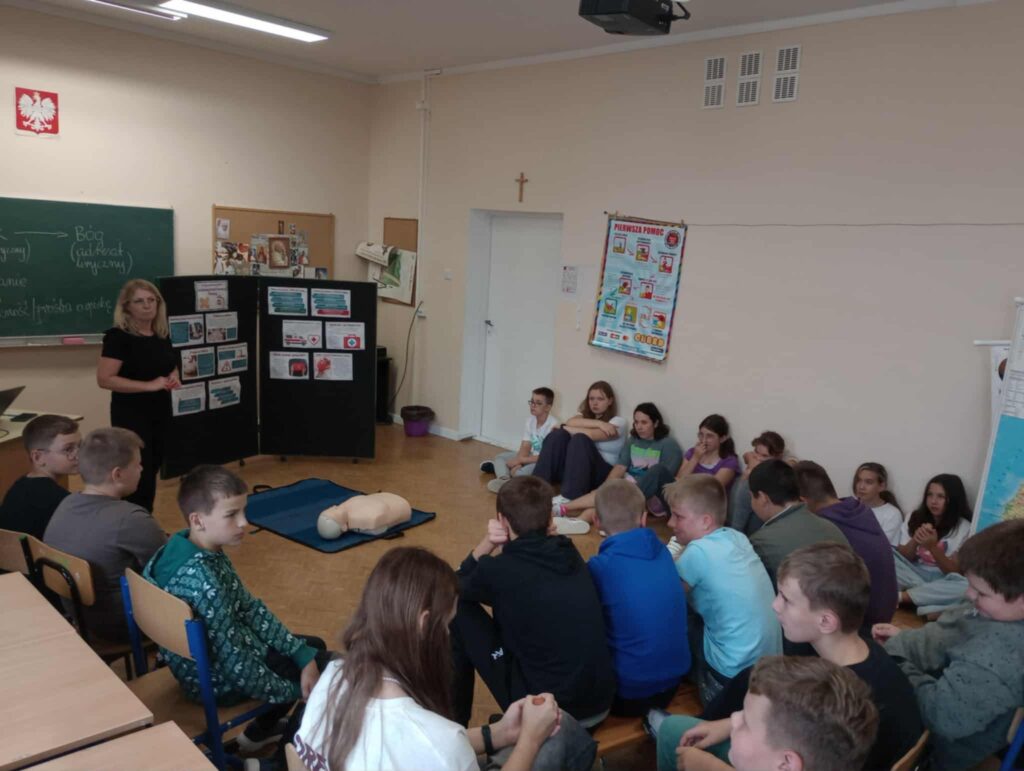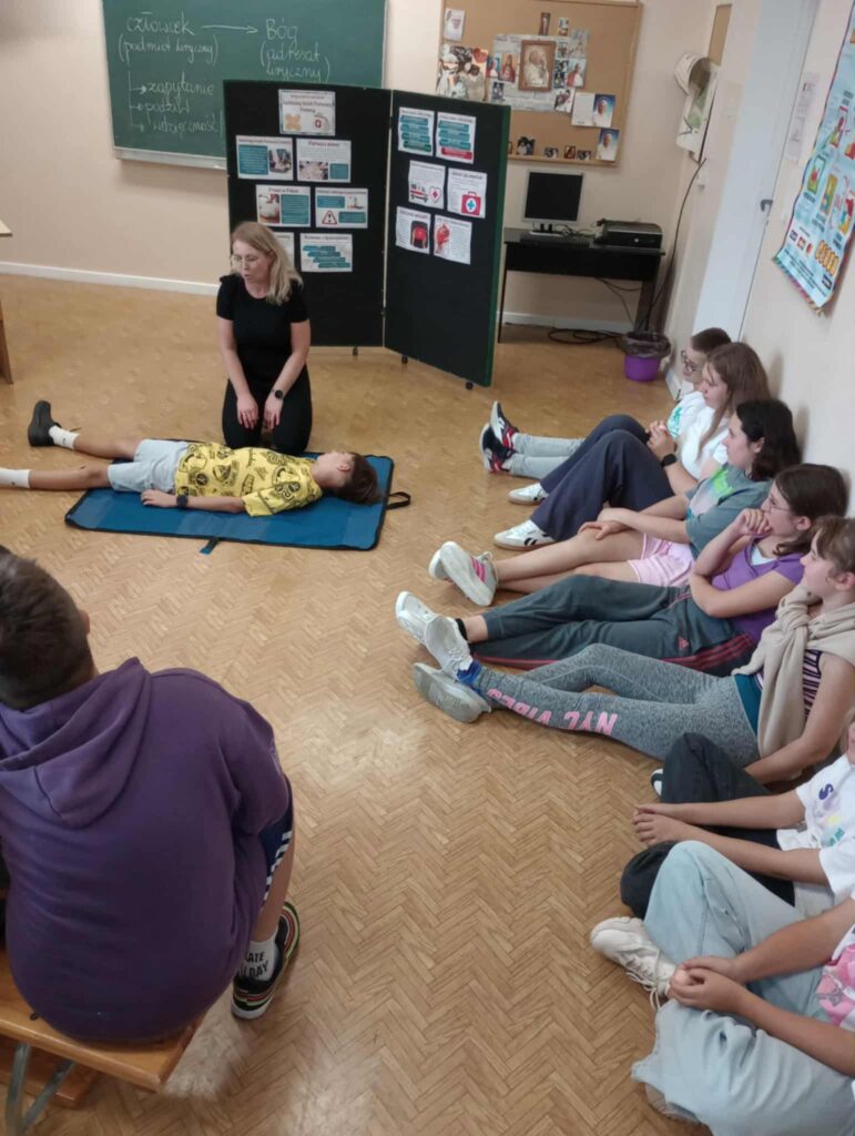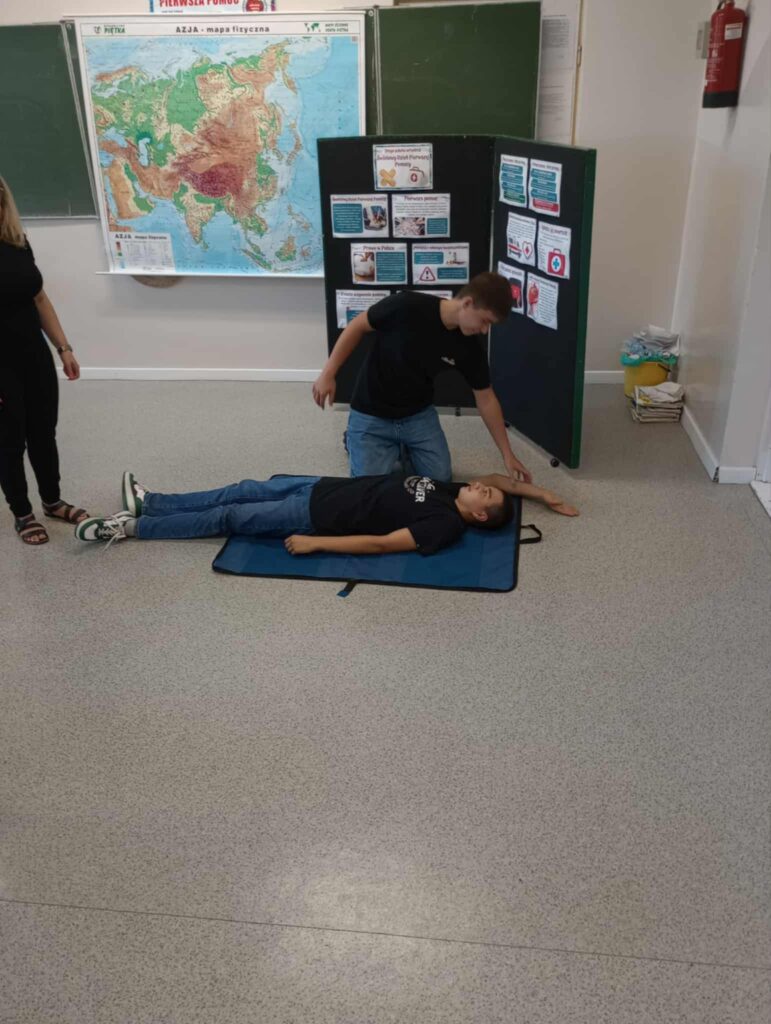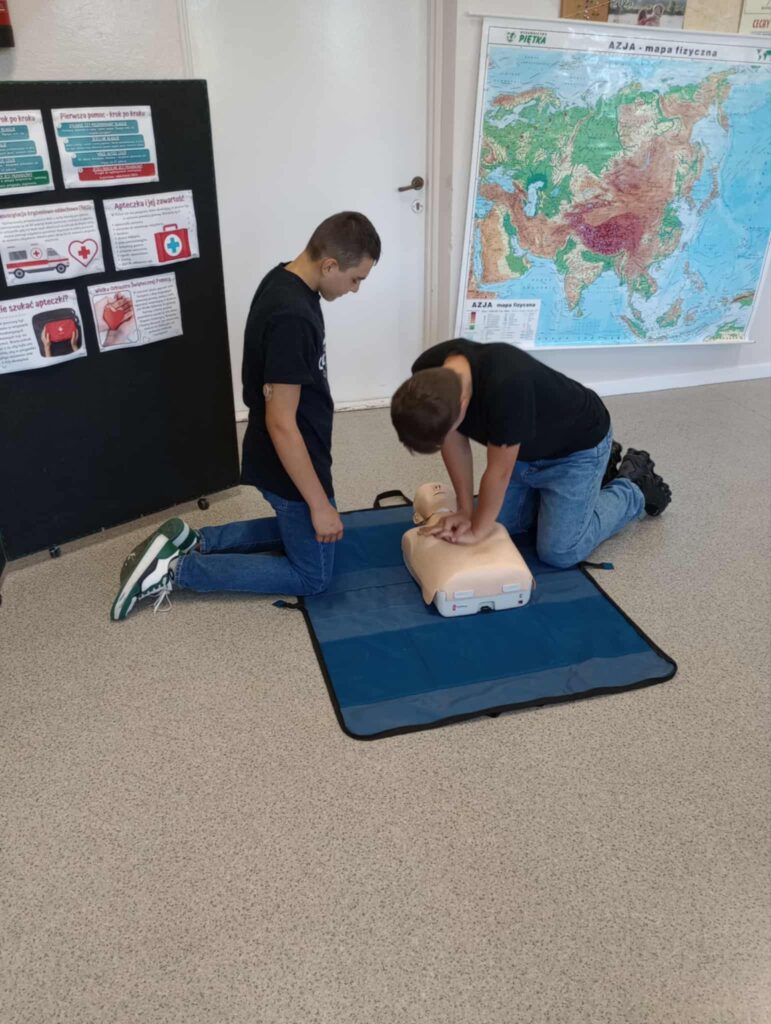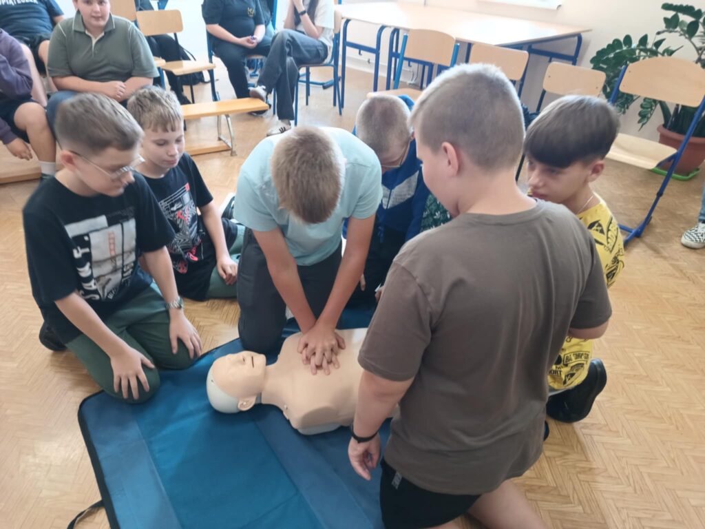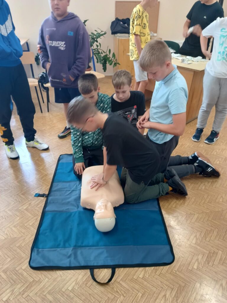 Uczniowie ćwiczyli resuscytację krążeniowo-oddechową (RKO) na fantomie, poznali zasady ułożenia poszkodowanego w pozycji bocznej bezpiecznej oraz uczyli się rozpoznawać sytuacje wymagające natychmiastowej interwencji. Dodatkowo została omówiona zawartość apteczki pierwszej pomocy i jej praktyczne zastosowanie – zarówno w szkole, jak i w codziennych sytuacjach.