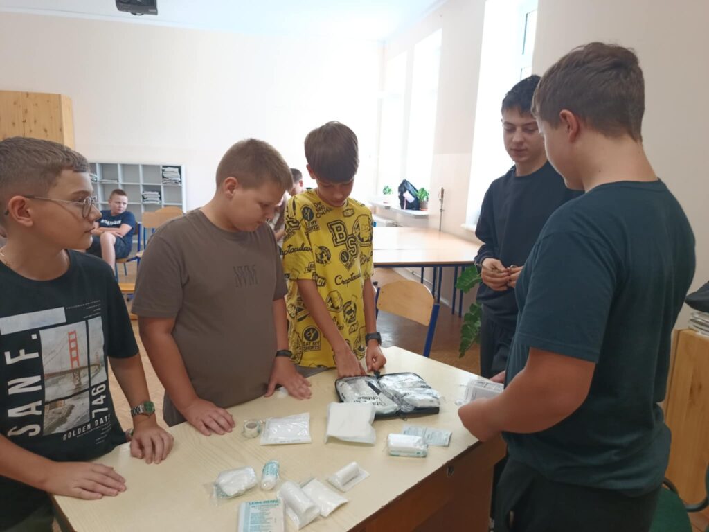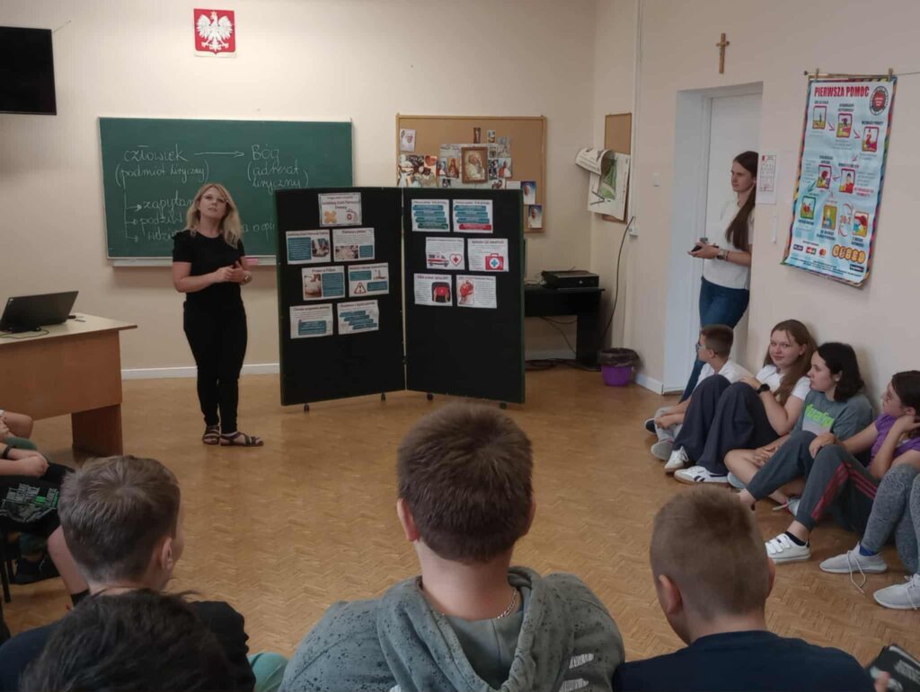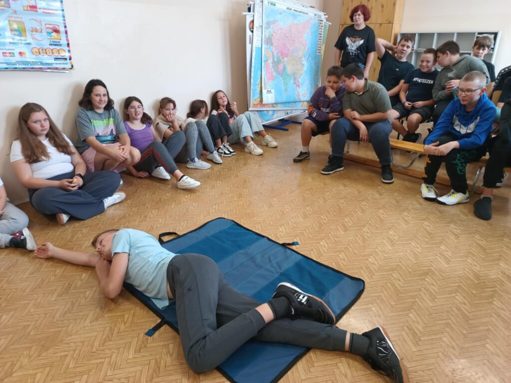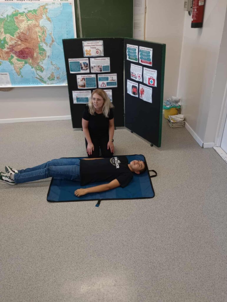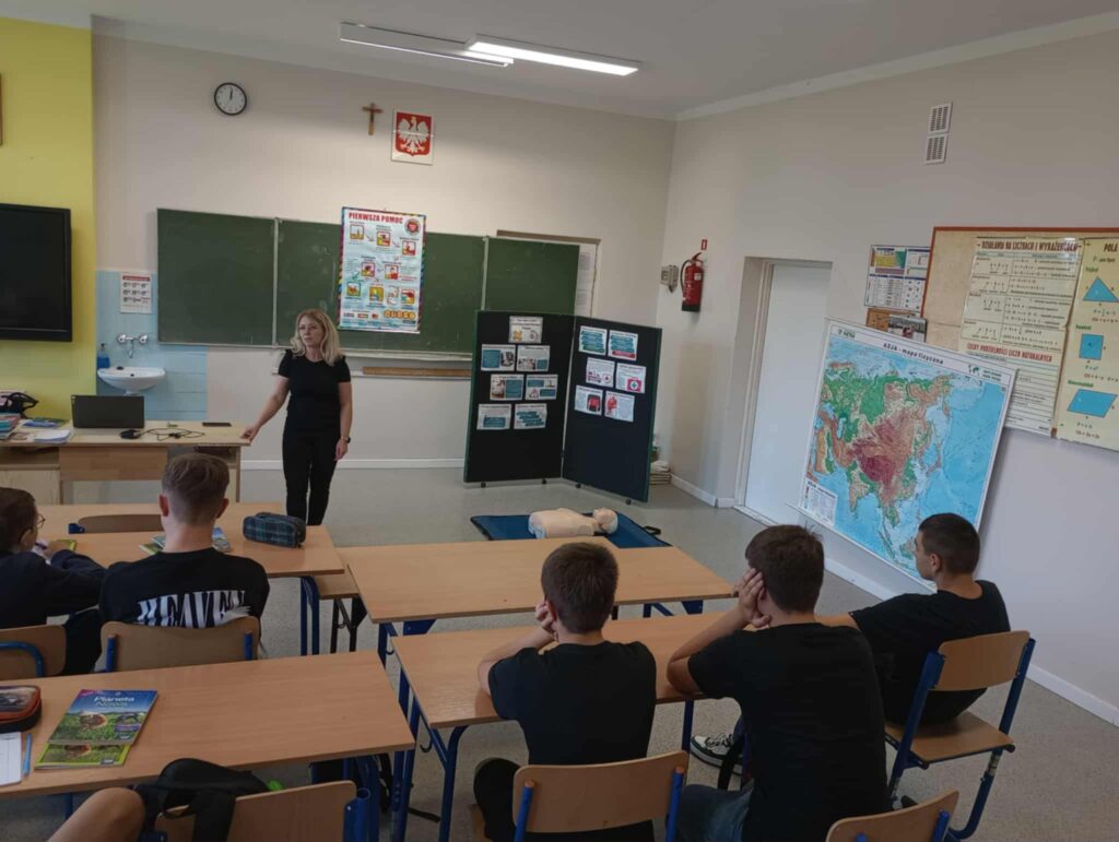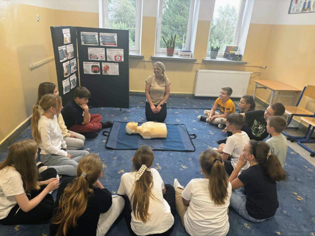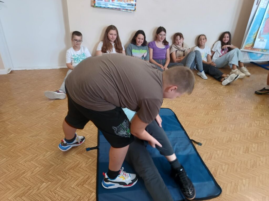 Uczniowie ćwiczyli resuscytację krążeniowo-oddechową (RKO) na fantomie, poznali zasady ułożenia poszkodowanego w pozycji bocznej bezpiecznej oraz uczyli się rozpoznawać sytuacje wymagające natychmiastowej interwencji. Dodatkowo została omówiona zawartość apteczki pierwszej pomocy i jej praktyczne zastosowanie – zarówno w szkole, jak i w codziennych sytuacjach.