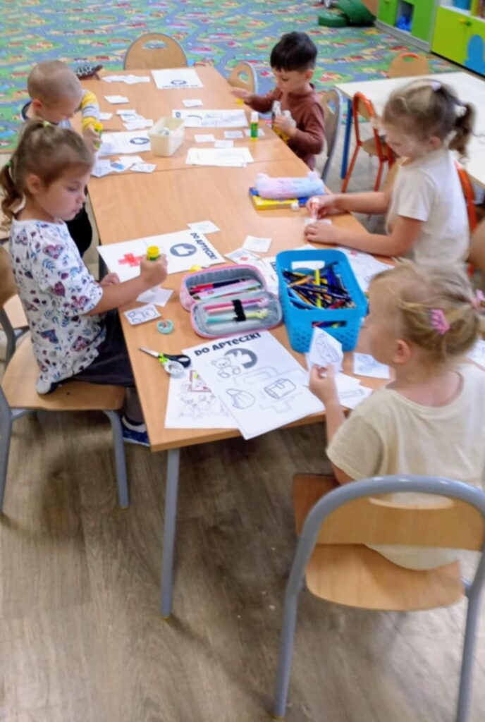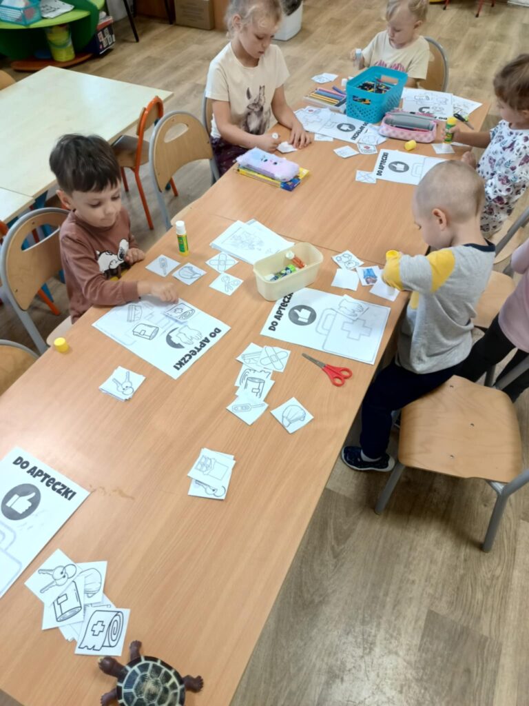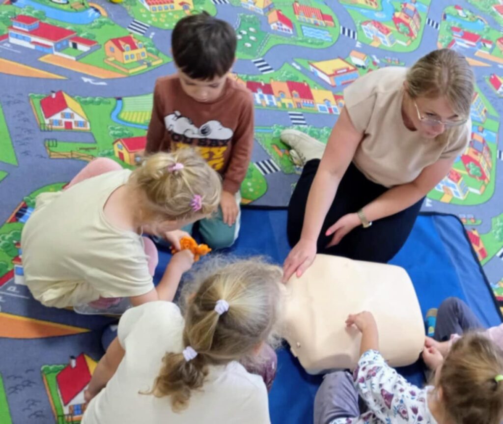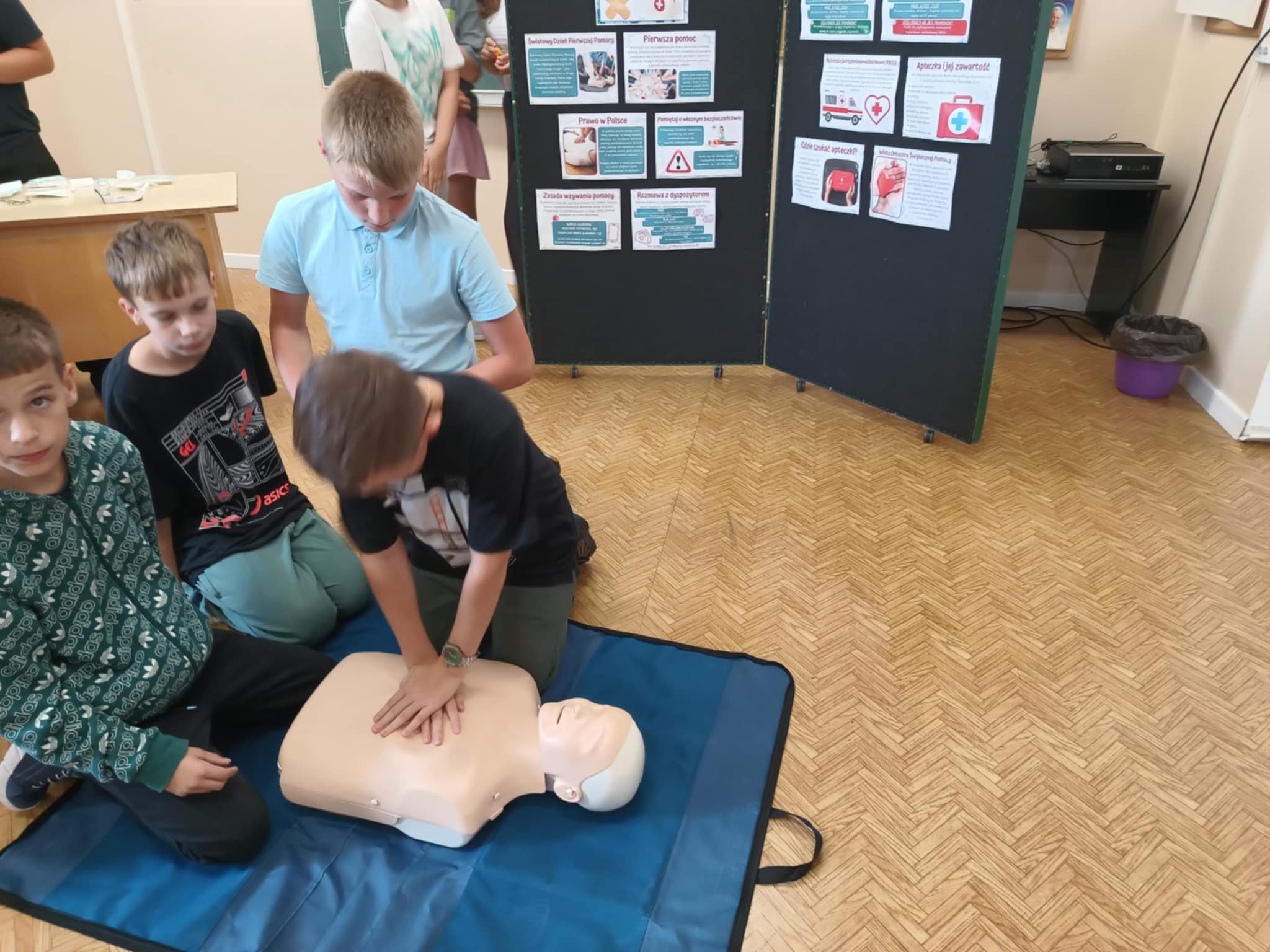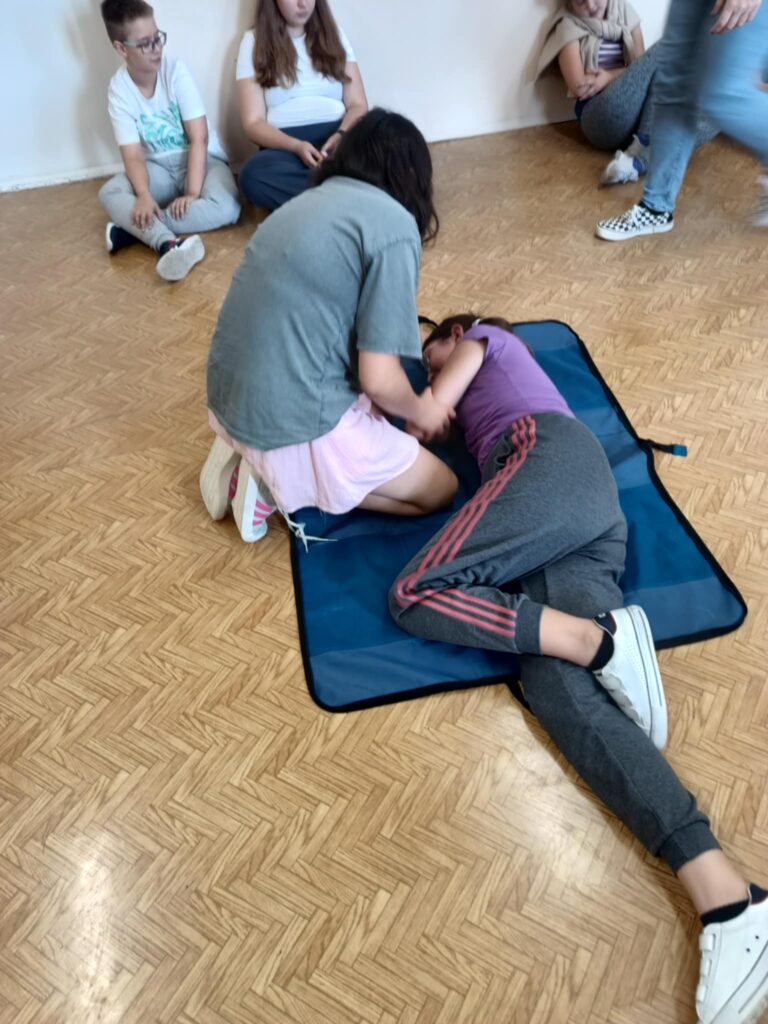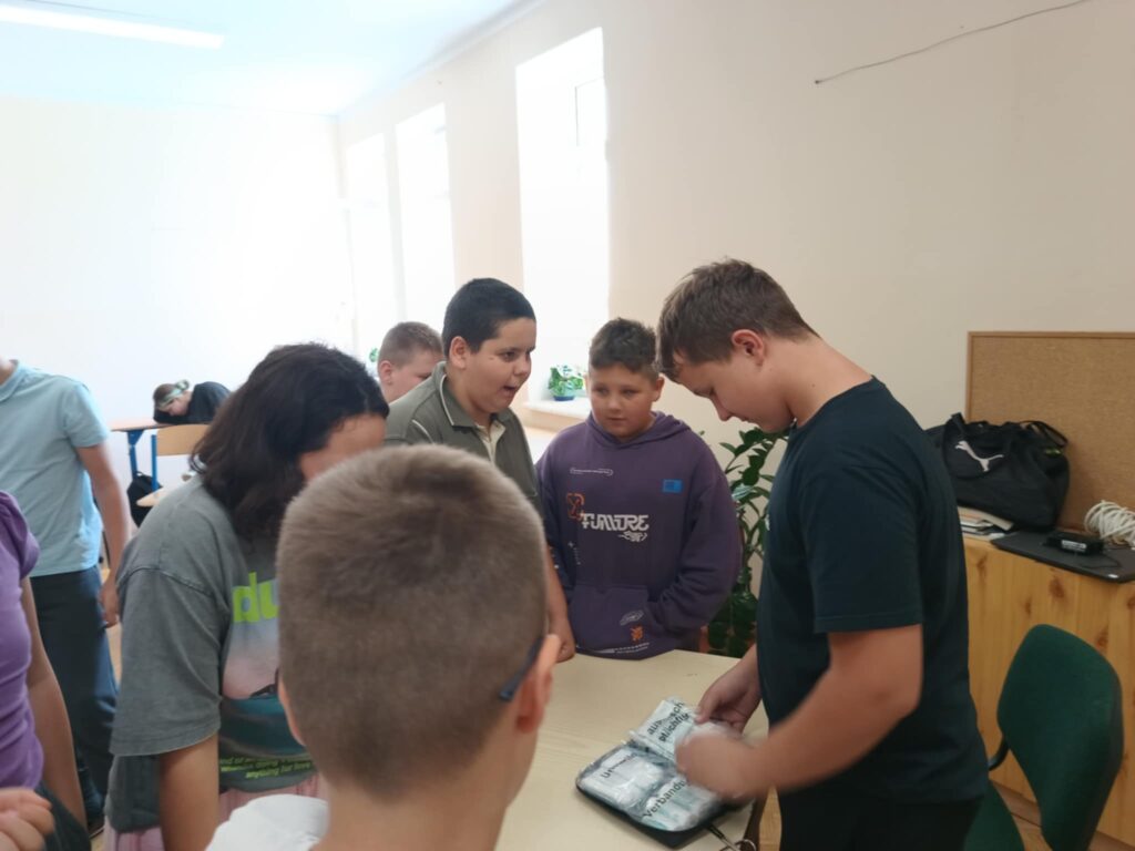 Uczniowie ćwiczyli resuscytację krążeniowo-oddechową (RKO) na fantomie, poznali zasady ułożenia poszkodowanego w pozycji bocznej bezpiecznej oraz uczyli się rozpoznawać sytuacje wymagające natychmiastowej interwencji. Dodatkowo została omówiona zawartość apteczki pierwszej pomocy i jej praktyczne zastosowanie – zarówno w szkole, jak i w codziennych sytuacjach.