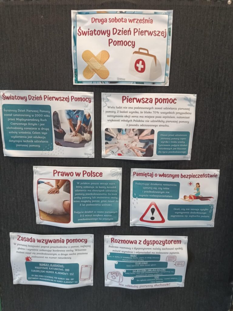 Światowy Dzień Pierwszej Pomocy, który każdego roku obchodzimy w drugą sobotę września, był w naszej szkole wyjątkową okazją do przypomnienia uczniom, jak ważne jest posiadanie podstawowych umiejętności, które mogą uratować życie.