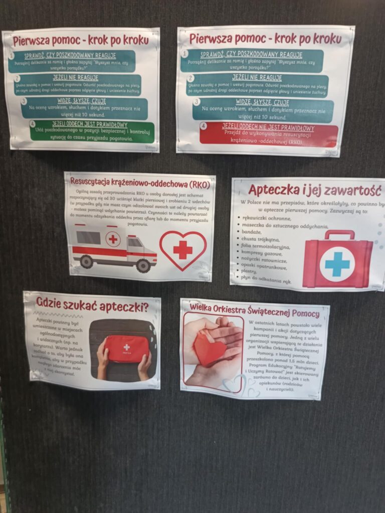 Zajęcia spotkały się z dużym zainteresowaniem, a wielu uczniów przekonało się, że udzielanie pomocy naprawdę jest w zasięgu każdego z nas. Na szkolnym korytarzu pojawiła się również okolicznościowa gazetka, która przybliżała uczniom najważniejsze informacje związane z udzielaniem pierwszej pomocy.