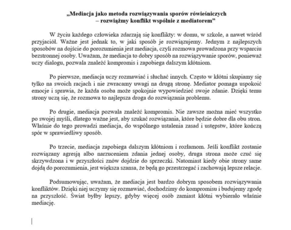 Udział w konferencji był wartościowym wydarzeniem, które umożliwiło wymianę doświadczeń oraz refleksję nad znaczeniem mediacji w pracy z młodzieżą. Spotkanie pokazało, jak istotne jest rozwijanie wśród uczniów umiejętności porozumiewania się, współpracy i rozwiązywania konfliktów w sposób konstruktywny.
