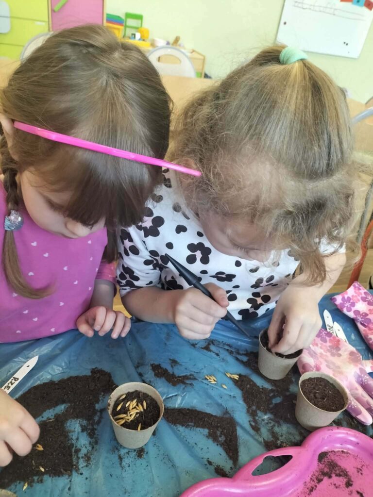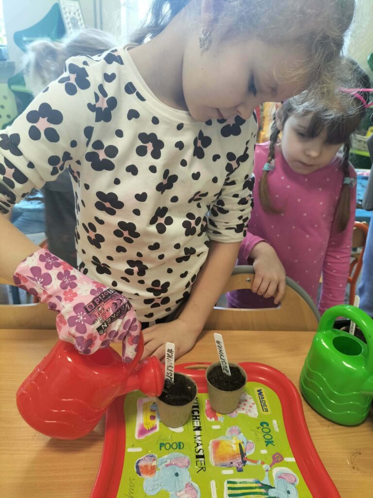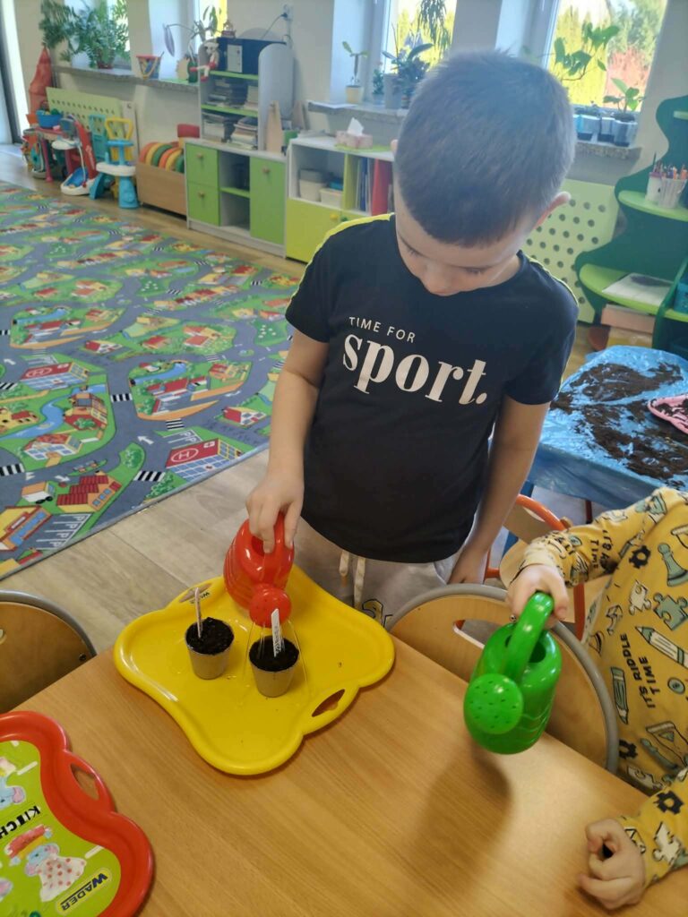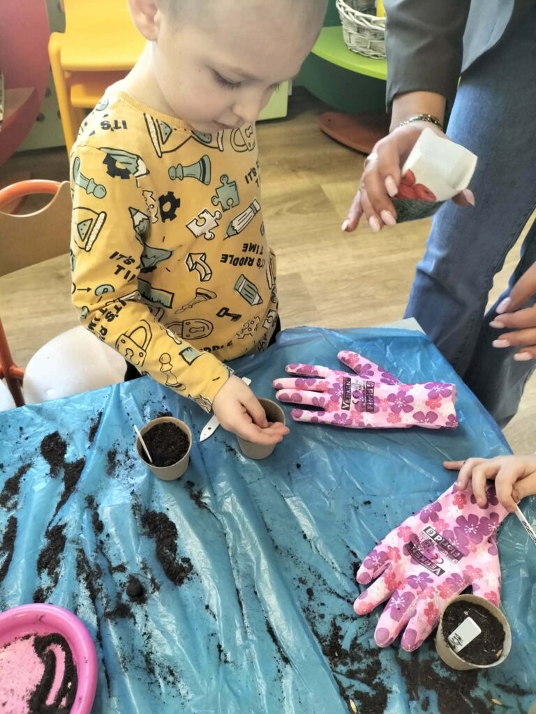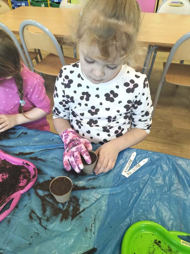 Aby łatwo rozpoznać swoje uprawy, dzieci oznaczyły doniczki podpisami. Dzięki temu będą mogły obserwować, jak z dnia na dzień pojawiają się pierwsze kiełki i jak rośliny się rozwijają. W kolejnych dniach przedszkolaki będą regularnie podlewać swoje rośliny oraz prowadzić obserwacje ich wzrostu, ucząc się cierpliwości i troski o przyrodę.