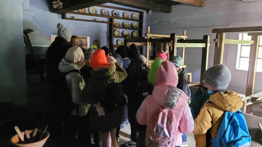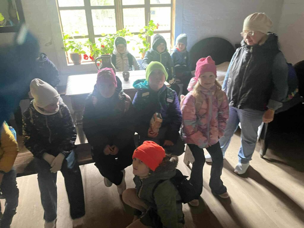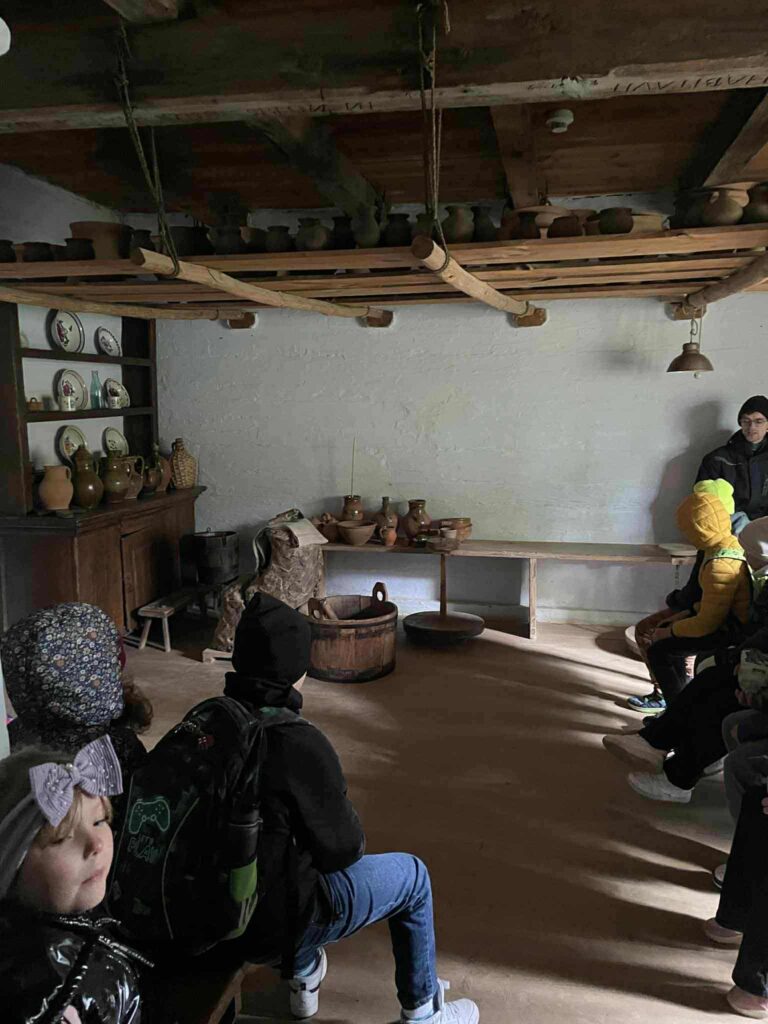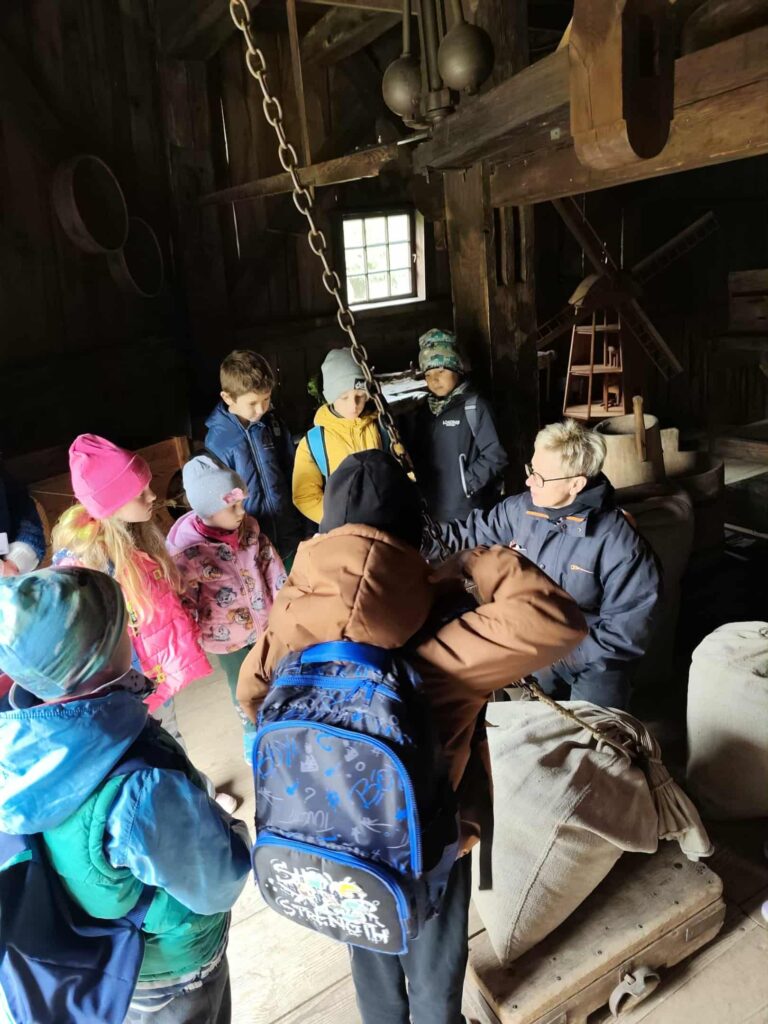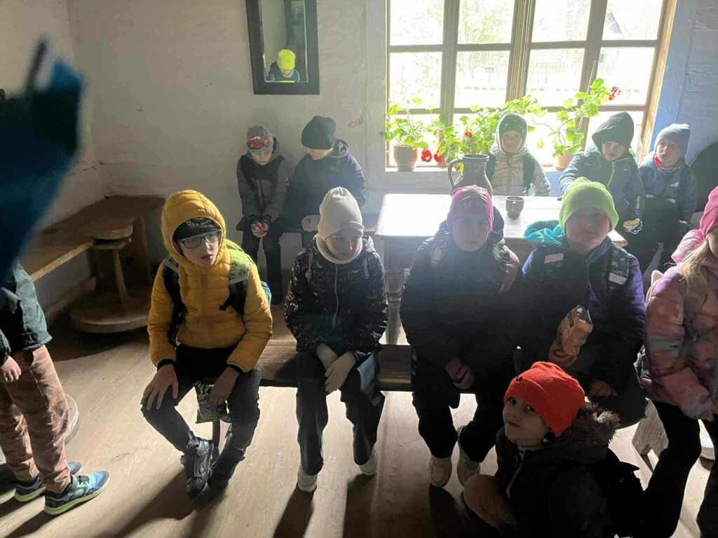 Po przyjeździe na miejsce uczniowie z ogromnym zaciekawieniem zwiedzali stare chaty, kuźnię, młyn oraz budynek w którym mieszkał i pracował garncarz. Przewodnicy opowiadali o codziennym życiu naszych pradziadków, dawnych zawodach, narzędziach używanych w gospodarstwach oraz zwyczajach ludowych. Dzieci miały okazję zobaczyć, jak wyglądało dawne gospodarstwo domowe.